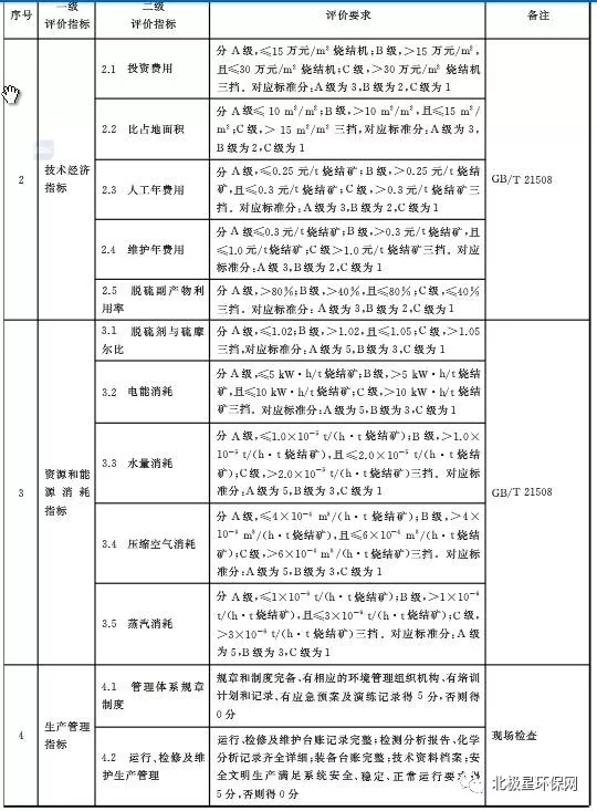 日前,中華人民共和國國家質(zhì)量監(jiān)督檢驗(yàn)檢疫總局、中國國家標(biāo)準(zhǔn)化管理委員會(huì)發(fā)布《鋼鐵燒結(jié)煙氣脫硫除塵裝備運(yùn)行效果評價(jià)技術(shù)要求GB/T 34607-2017  》。根據(jù)標(biāo)準(zhǔn)要求,鋼鐵燒結(jié)煙氣脫硫除塵裝備運(yùn)行效果評價(jià)總分為100分,其中:脫硫裝備包括環(huán)保性能評價(jià)30分,技術(shù)經(jīng)濟(jì)評價(jià)15分,資源和能源消耗評價(jià)25分、生產(chǎn)管理評價(jià)10分和主要裝備性能評價(jià)20分;除塵裝備包括環(huán)保性能評價(jià)40分,生產(chǎn)管理評價(jià)20分和主要裝備性能評價(jià)40分。濕法脫硫性能指標(biāo)包括SO2排放濃度、SO3排放濃度、脫硫效率、霧滴濃度、顆粒物排放濃度、NOx濃度、二惡英濃度等,詳見表1。半干法/干法脫硫性能指標(biāo)包括SO2排放濃度、SO3排放濃度、脫硫效率、顆粒物排放濃度、NOx濃度、二惡英濃度等,詳見表2。電除塵、袋除塵主要性能指標(biāo)包括顆粒物濃度、去除率、本體漏風(fēng)率、壓力降等,詳見表3、4。
